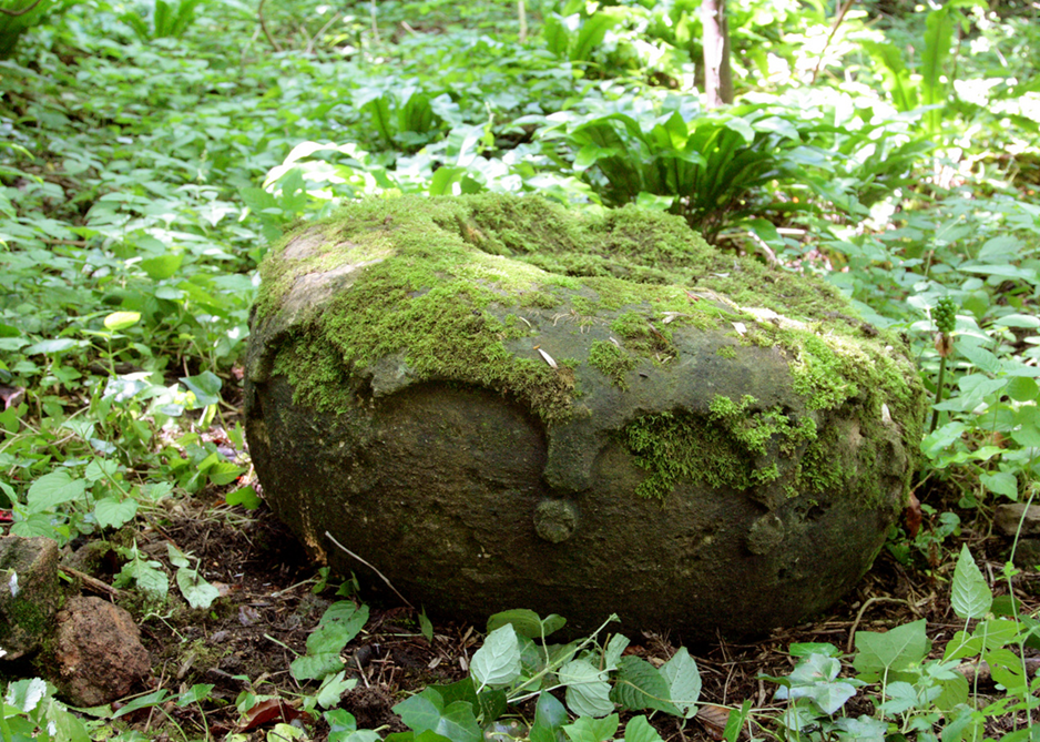 One final artefact is worthy of note – referred to as the stone doughnut. This is the last portion of one of the other urns, the larger structures from the very top of the lodge. These urns were formed with great bulbous centres surmounted by tapered pinnacles from which stone flames once emitted. At some point one of these urns fell from the lodge, shed its pinnacle, and rolled like a wheel much further than any of the other debris, finally coming to a rest at the very edge of the woods. There is survives today, too massive an heavy to move, but, hopefully, salvageable someday.