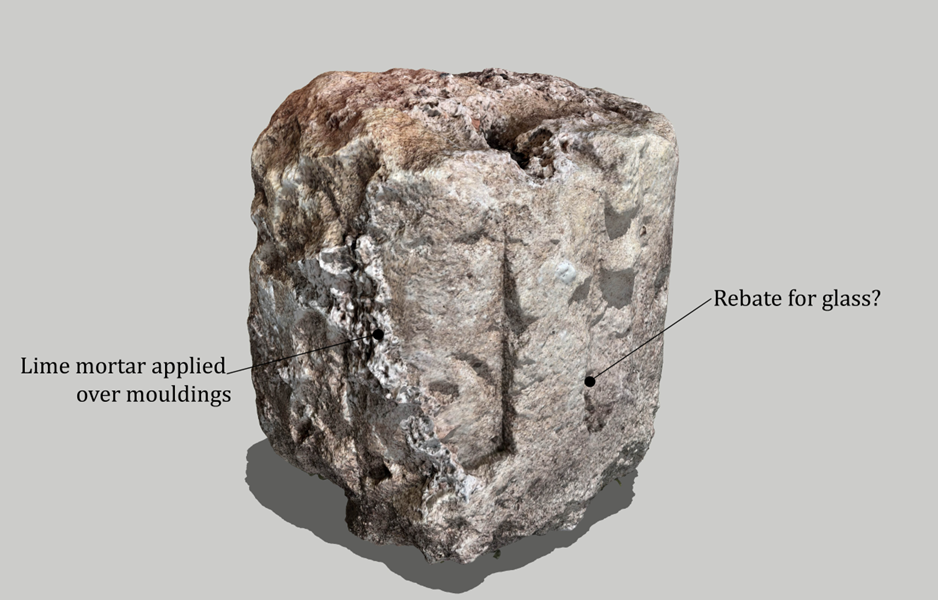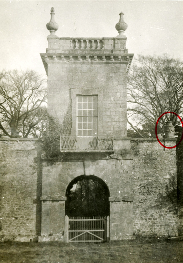 So far, five individual stones have been salvaged, four of which have since been identified as having been parts of monumental urns from the flanks of the 18th Century building. There were two types of urns on the building, four on the central tower, and four squatter cylindrical ornaments lower down on the supporting piers; in their general form these were designed to evoke ancient roman temple altars. The fragments come from these