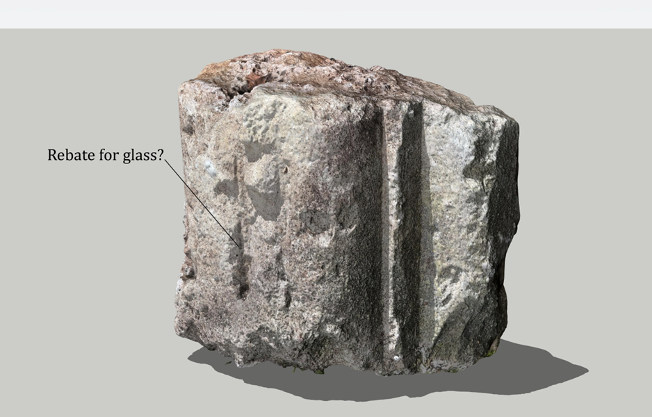 A fourth stone is more of a puzzle. It doesn’t correspond with any known detail of Penpole Lodge, either from photos or recorded in survey drawings made in 1947. One side of it has white mortar applied over its carved detailing, suggesting it was re-used from elsewhere. The carving is regular and linear, and has convex and corner mouldings on two of its outer edges. A rough slit runs up most of the ling edge, suggesting it was a rebate for glazing. The mouldings stop close to the bottom, suggesting it connected with something at its lower edge.