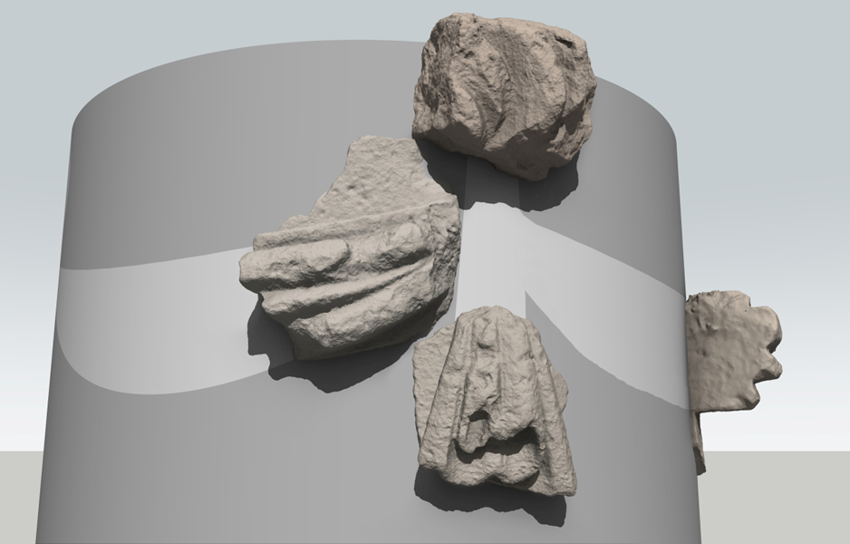 Having scanned the stones using photogrammetry, it’s been possible to arrange them to suggest how they might have fitted together. But, we’re far from certain whether the fragments were in this actual configuration, as none of them fit together. The two swags are from similar locations from two of the swags.