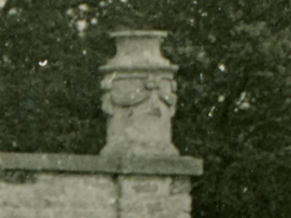A photograph taken shortly before Penpole Lodge was demolished shows it in a derelict condition and from the angle taken three of the cylindrical urns had already been toppled and lost. The fragments now discovered are most likely to have been from the most northerly corner, out of view from the photographer here. The other urn on the western corner had vanished much earlier, and the location of fragments close to the surface suggest they arrived there at about the time the building was disintegrating by one means or another.