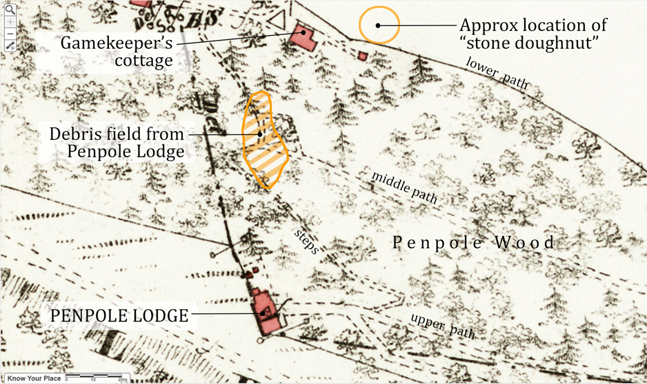 July’s working party location coincided with a large pile of rubblestone strewn down the hillside at the foot of the steps through Penpole Wood. It’s an area we’ve explored before, with the knowledge that the stones are some of the last remnants of Sir John Vanbrugh’s Penpole Lodge that once stood immediately above.