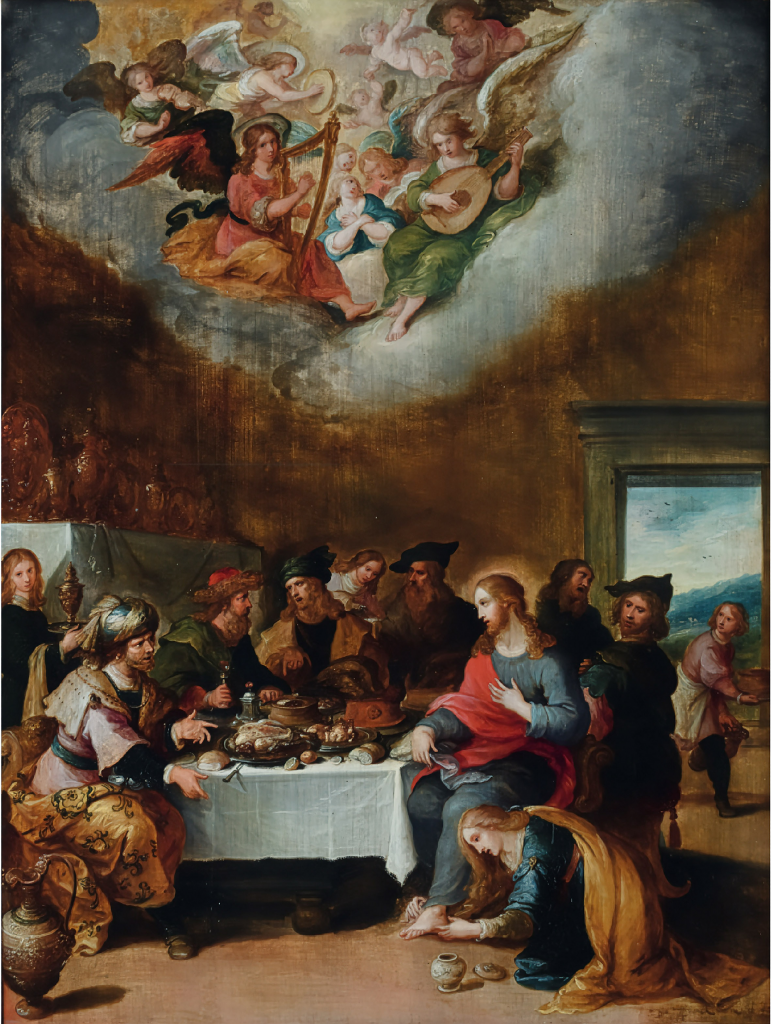 An inventory of the contents of the house in 1777 describes the painting as “The washing of our saviour’s feet” and the artist as “Old Frank”. This attribution has now been revised and is now considered to be by his son, Frans Francken the younger (1581-1642). The 18th-century attribution to Francken the Elder likely stems from the signature “D.o. ffranck,” where “D.o.” stands for the Flemish de oude, meaning “the Elder.” However, this signature was actually used by Frans Francken the Younger from the late 1620s. Prior to the death of his father in 1616, he had signed his works as “the young Frans Francken.”