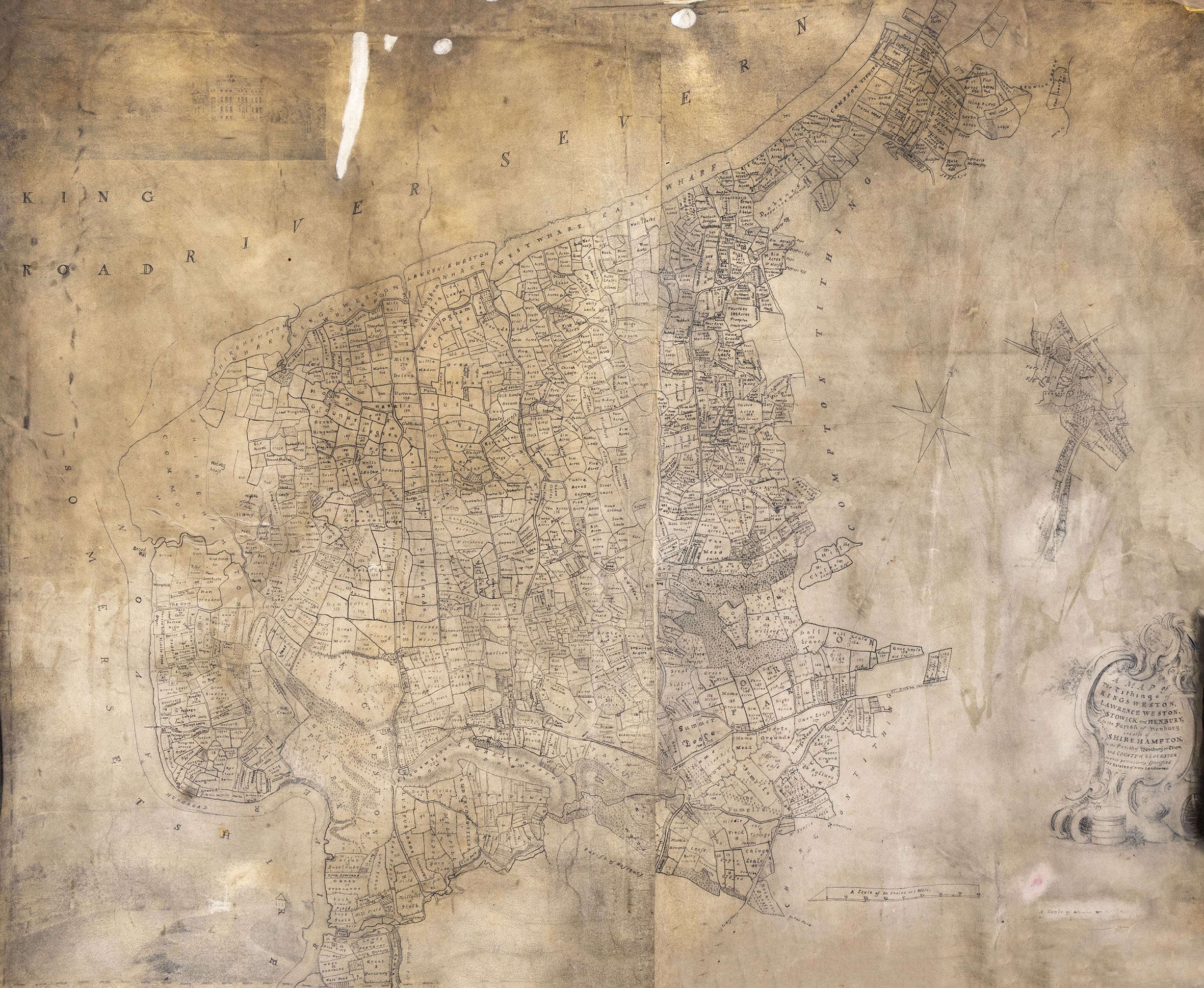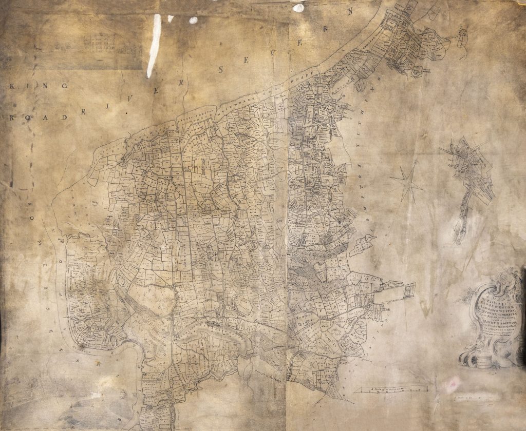 The new estate map is also drawn by Tailor, but is instead a single rolled large-format map of the entirety of the Kings Weston estate. It is dated 1773, the date after the bound series of maps and no doubt commissioned by the Southwell Family as an alternative way of keeping track of their estates. Unlike the 1772 survey, this later version is at a larger scale. It’s also different in showing clear signs of having been updated and altered in a different hand. These changes appear to reflect changes in ownership of parcels of land and redraw detail that has become feint or worn through use.