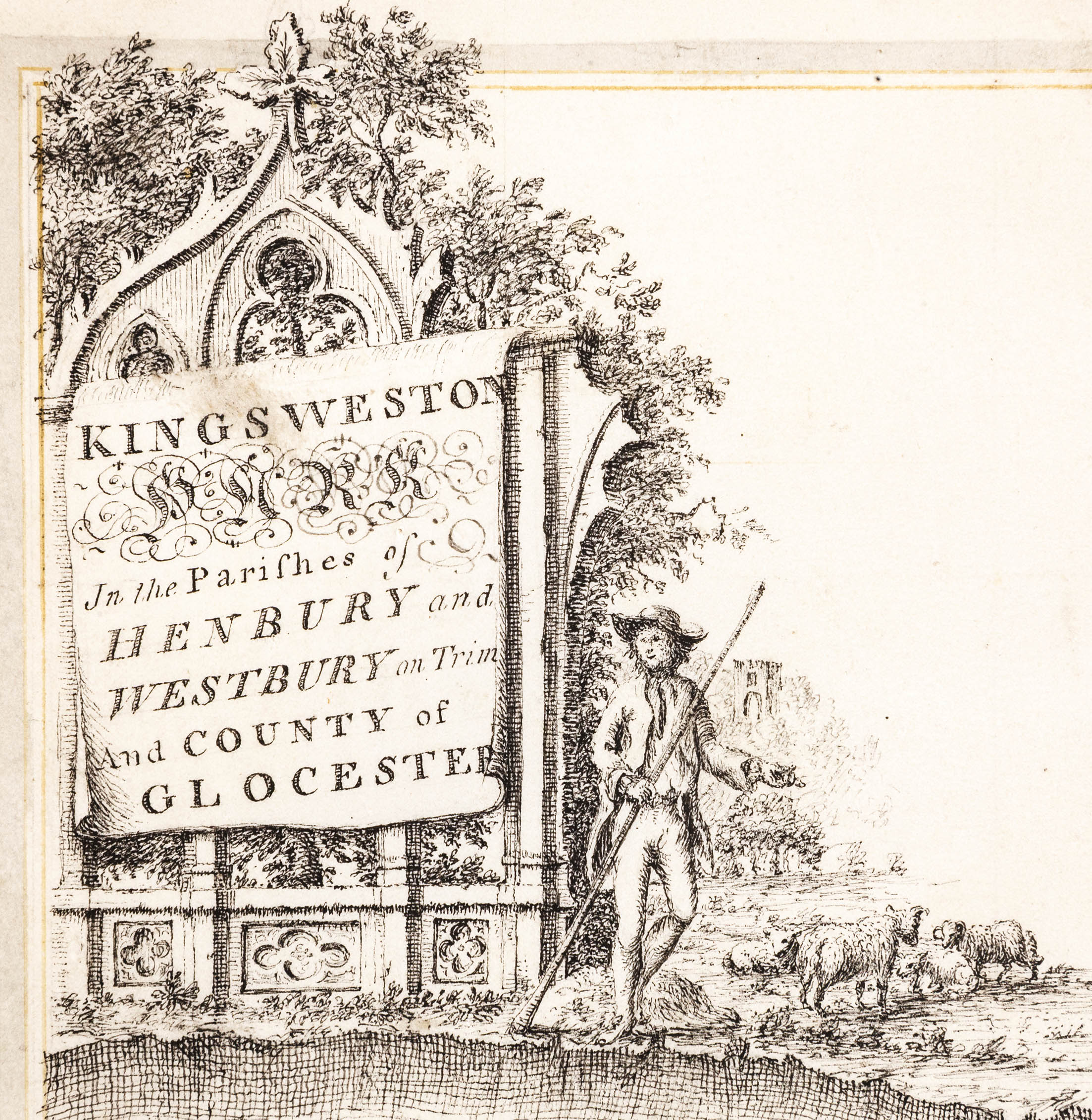 There are two, one in each corner on the left hand side. Sadly, they are very dirty and difficult to make out. The lower one is a scene on the Avon at Lamplighters, but very little detail is discernible to be of much interest. The other is more interesting to the Kings Weston story, being a rare early depiction of the house itself from the south.