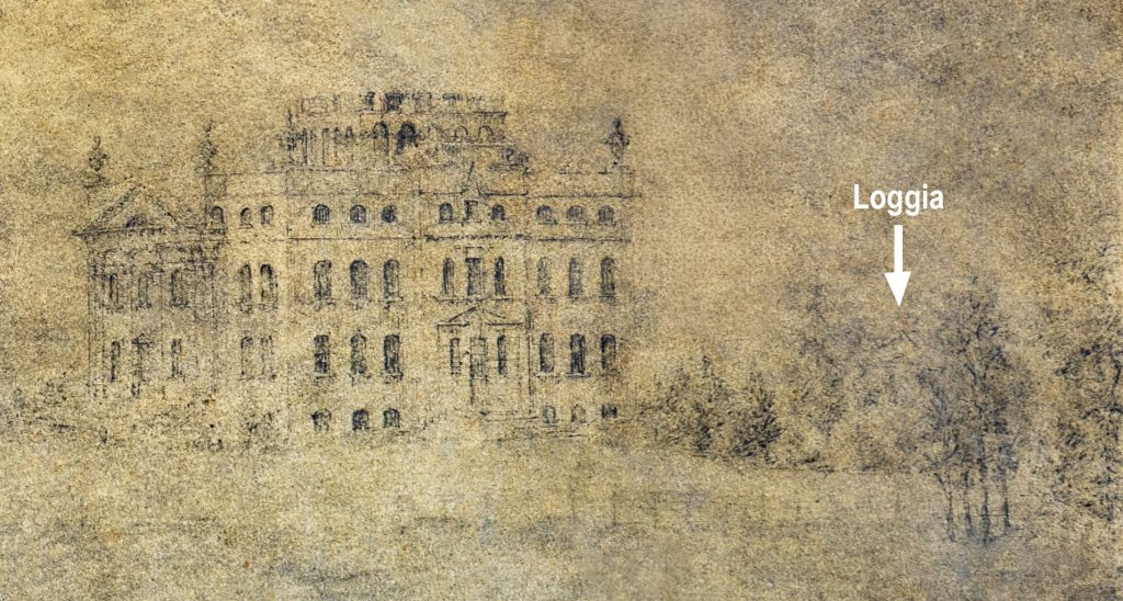 The drawing is better preserved, but is still badly stained and dirty. The house is recognisable on the right hand side, with the pediment of the Loggia just visible over the top of the shrubbery. Also discernible is the avenue of lime trees approaching from the left. The planting differs little from today, though trees and shrubs have definitely matured from the illustrated state.