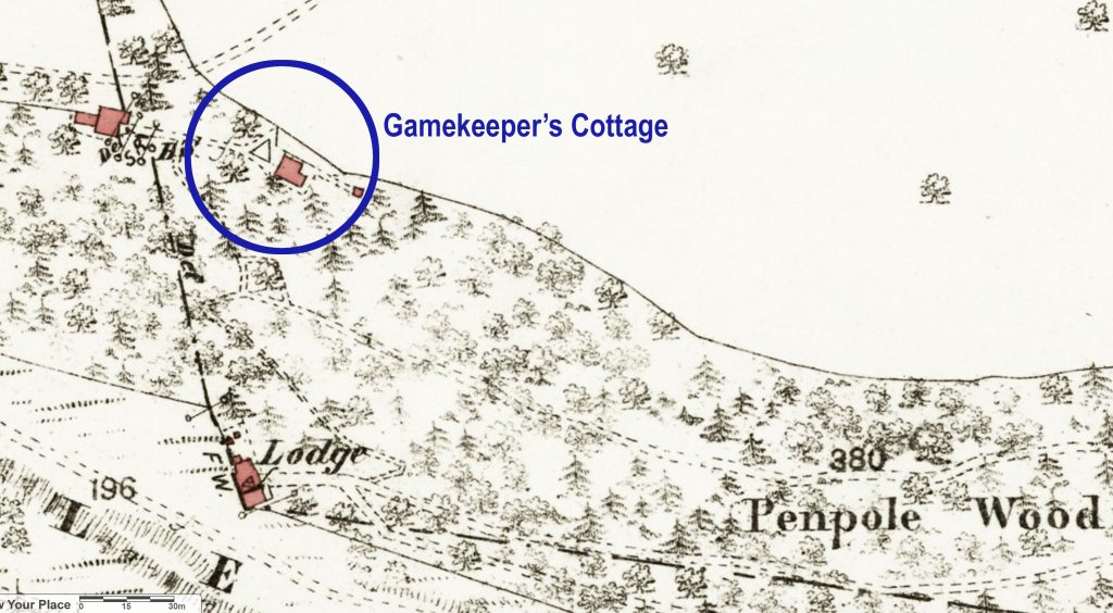 The location at the foot of the Penpole Ridge once enjoyed views northward across open fields of the parkland, but today’s woodland margins have long extended to encompass it. It is assumed that any game shooting would have taken place in these fields with pheasant or other birds bred in the woodland before release. The location of a gamekeeper’s cottage on the boundary between these two areas makes sense in this context.