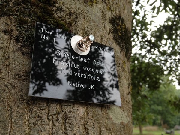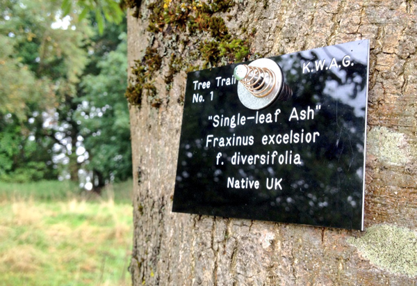 KWAG created a tree Trail taking in all the most interesting and important trees on the estate with the assistance of Richard Bland and funding from the National Lottery. The trail is marked by a series of identification labels, many seen here, and the accompanying walk can be obtained from our Downloads section.