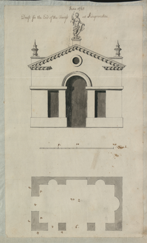 - Vanbrugh’s second, 1718, design for the Loggia to front the old banqueting House at Kings Weston. BRO 33746 no030