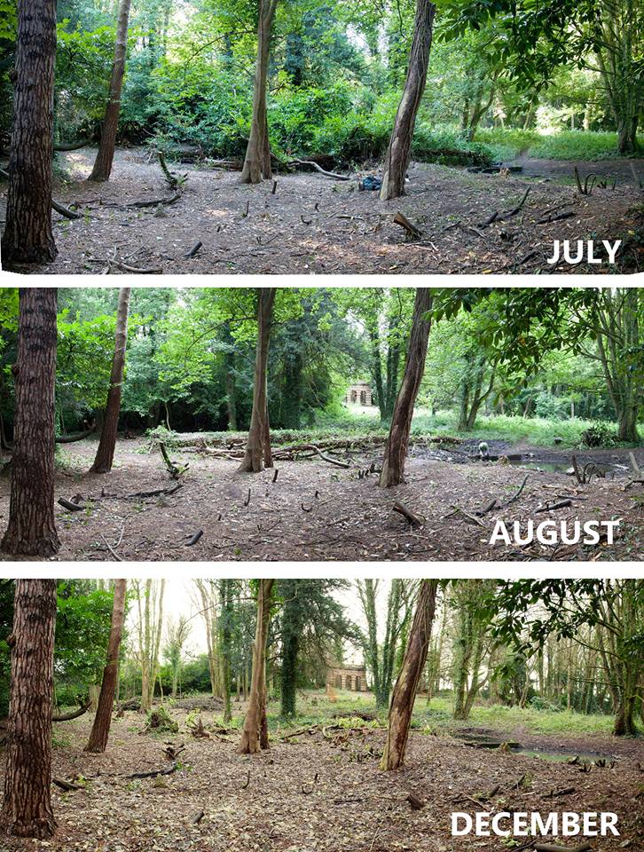 - looking up from teh ponds over several months shows the impact of our work on bringing sunlight into the woodland for other species to take advantage of.