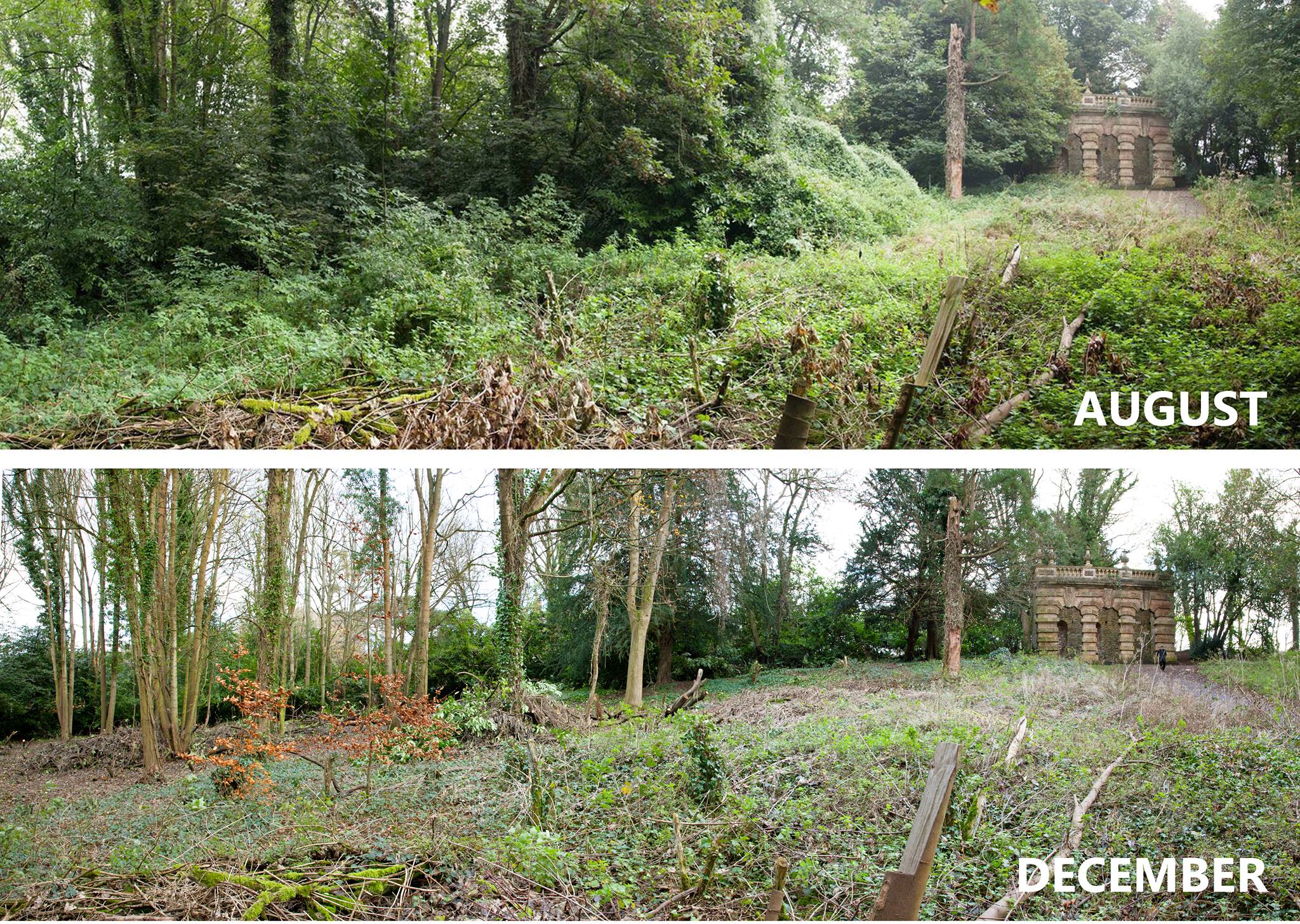 Our clearance has opened out the whole area as far as the Eighteenth Century path that runs around the back of the woods here, and has restored views of the Echo from all manner of new perspectives. Our final working party on December 6th reached the very last corner of the area and has completed this phase of the project.