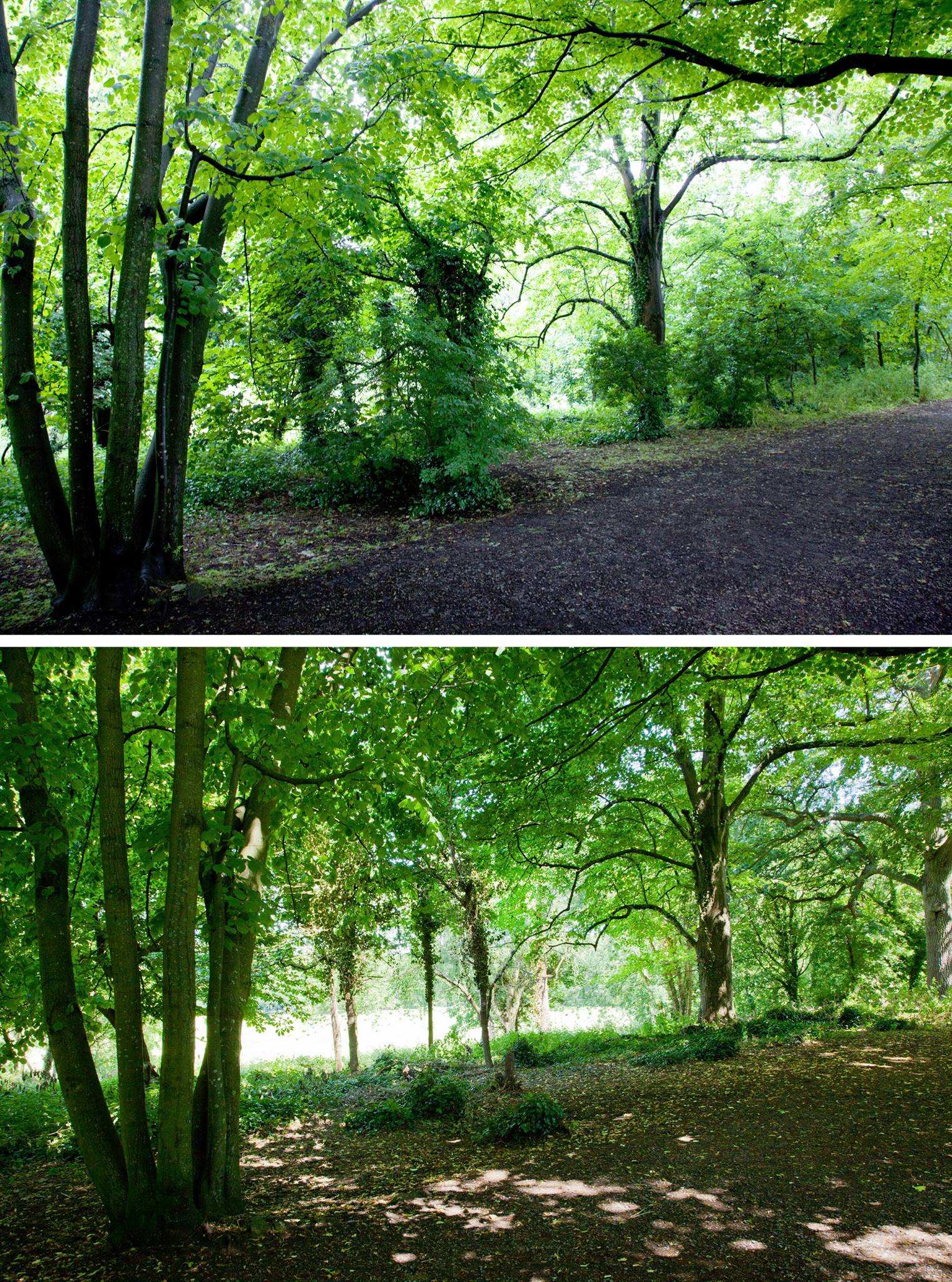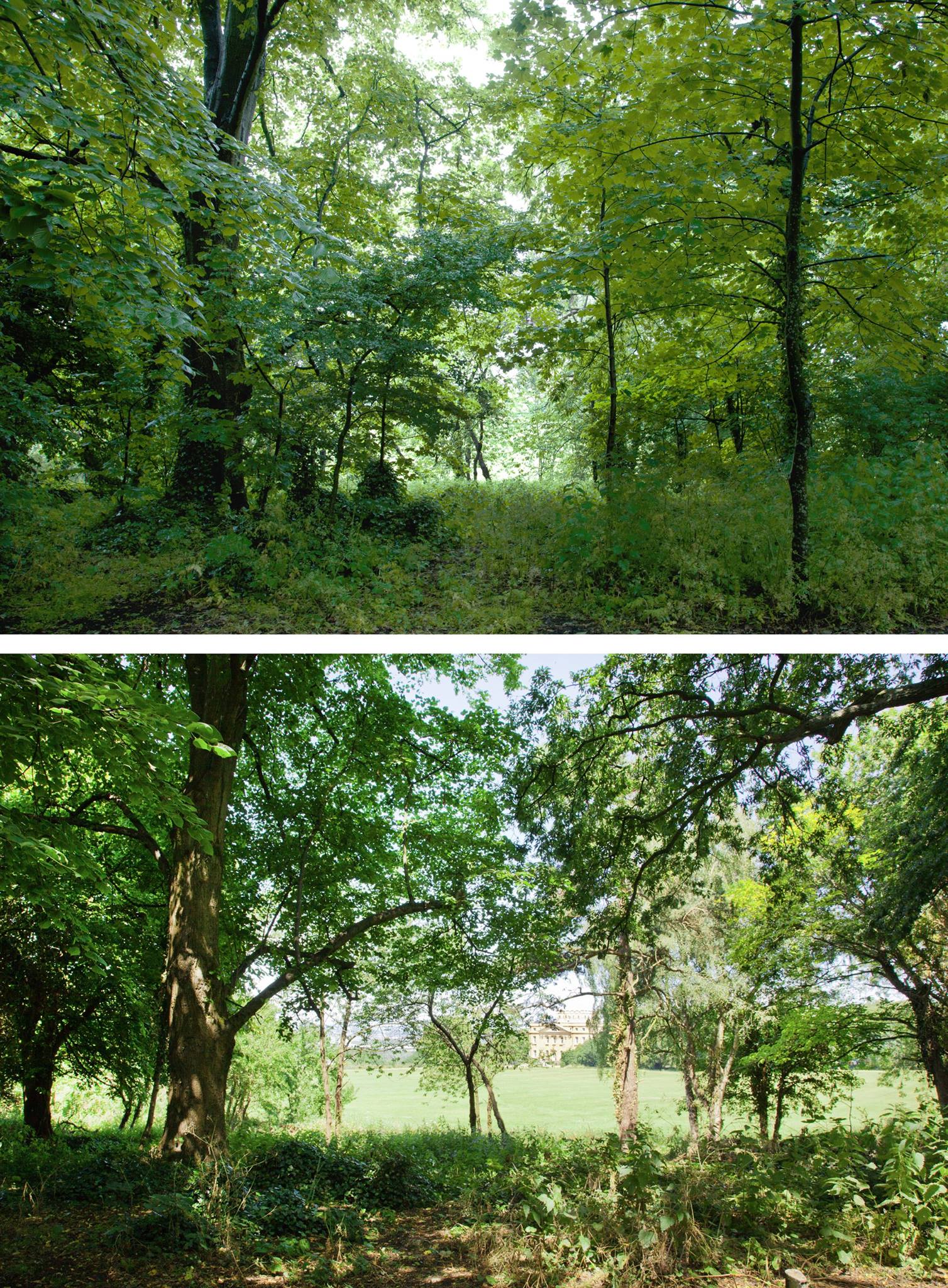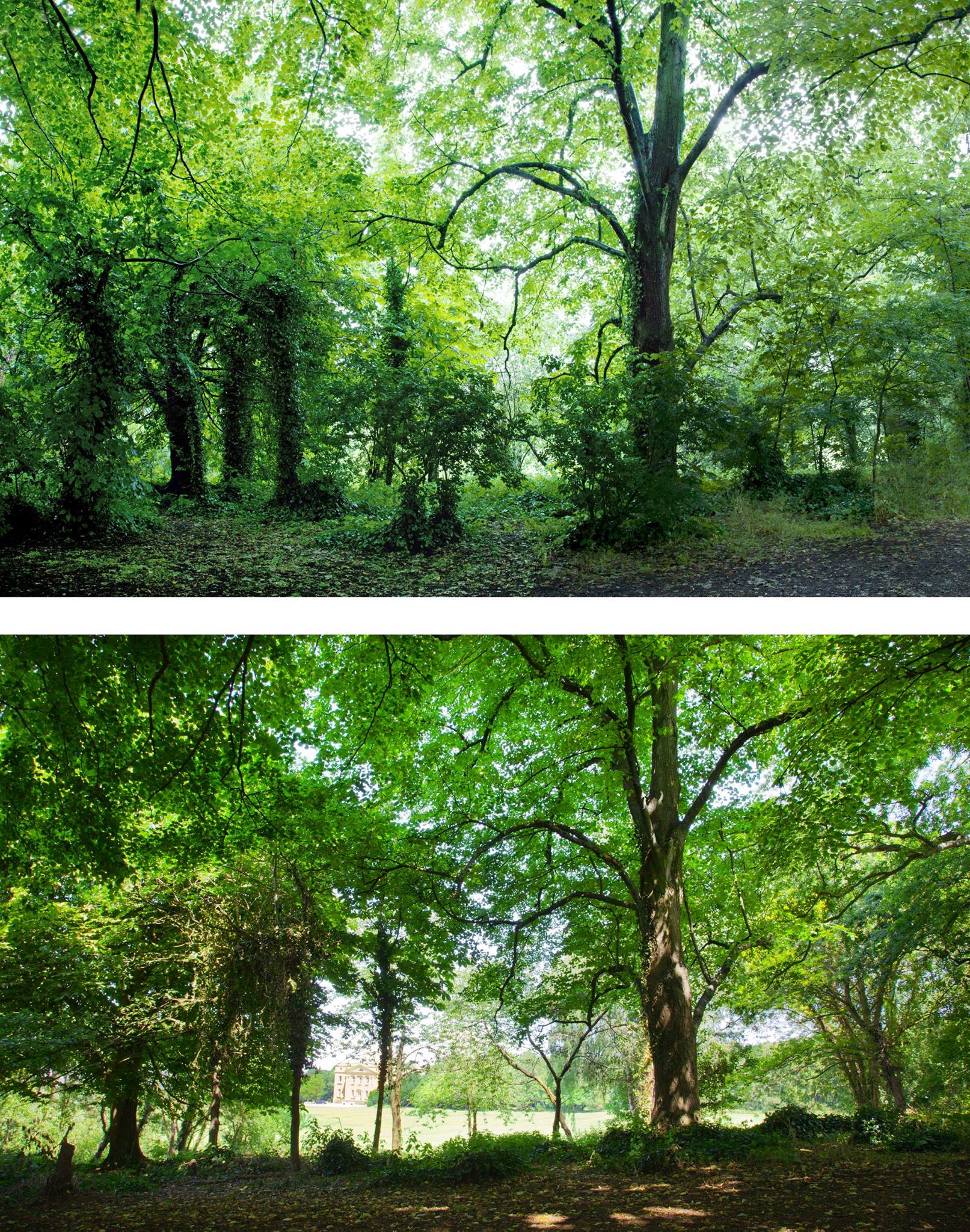 In June 2015 we continued work along the South Walk as part of our Lifting the Curtain project. The trees are denser here, and there is a deeper boundary between the path and the open meadow around Kings Weston house. Results have been impressive, but the views of the house less frequent. Never-the-less there have been additional benefits in having opened up views of some of the historic parkland trees that had been obscured by undergrowth, and now stand a better chance of thriving against more youthful competition! Click on the gallery images below the main images to see more.