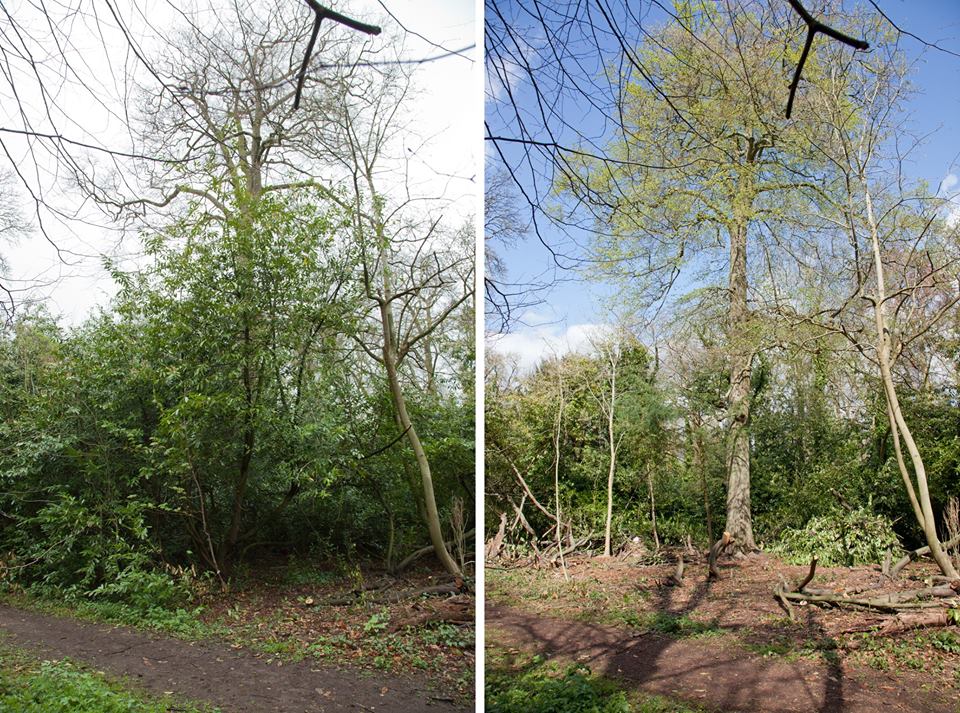 Working back into the laurel to the north of the avenue into Penpole Wood with the target of liberating a mature beech tree from the suffocating invader.